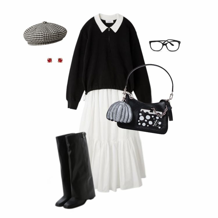 白のティアードロングスカートに、黒の襟付きプルオーバーを合わせたモノトーンのシックなスタイルです。黒のニーハイブーツ、千鳥格子のベレー帽、黒縁メガネで、知的なレトロ感を演出しています。 耳元に輝く鮮やかなレッドのピアスが、モノトーンコーデに強烈なアクセントを加えます。赤はハロウィンカラーの代表格であり、さりげない一点投入で、大人の女性にふさわしい上品な華やかさと情熱を演出します。