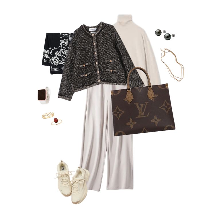 タートルネック×ワイドパンツ×ツイードジャケットの組み合わせで、都会的な大人旅を演出します。落ち着いたカラーコーデにモノグラムのアクセントが映え、洗練された印象を与えます。