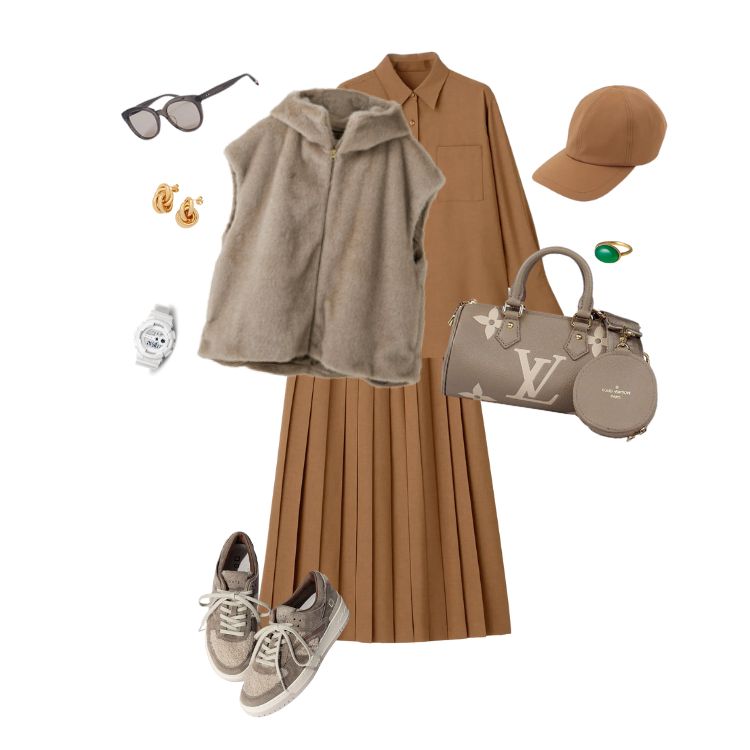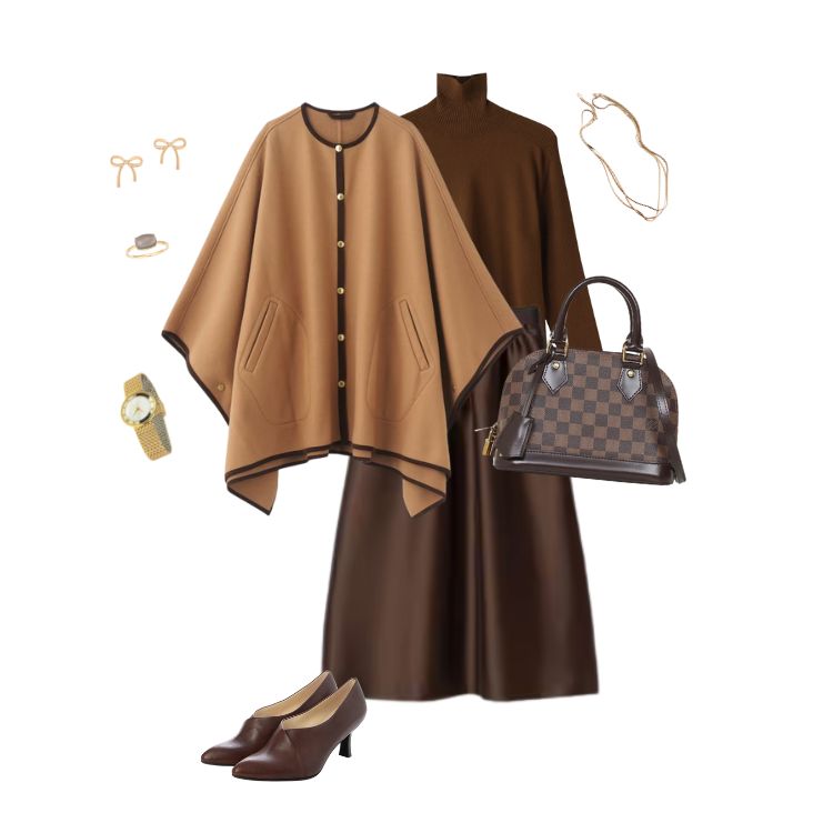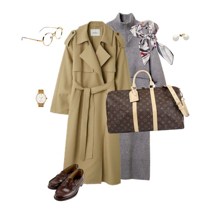 トレンチコート×ニットワンピース×ローファーの組み合わせで、上品かつクラシックな旅スタイルに仕上がります。ベージュやグレーなどの秋色を取り入れることで、ルイ・ヴィトンのモノグラムと調和し、季節感のあるエレガントな印象を演出します。