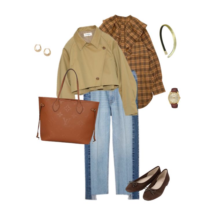 チェック柄シャツ×デニム×フラットシューズの組み合わせで、カジュアルな紅葉トリップにぴったりです。シンプルな装いにバッグのコニャックカラーを差し色として取り入れることで、季節感のあるこなれた印象に仕上がります。